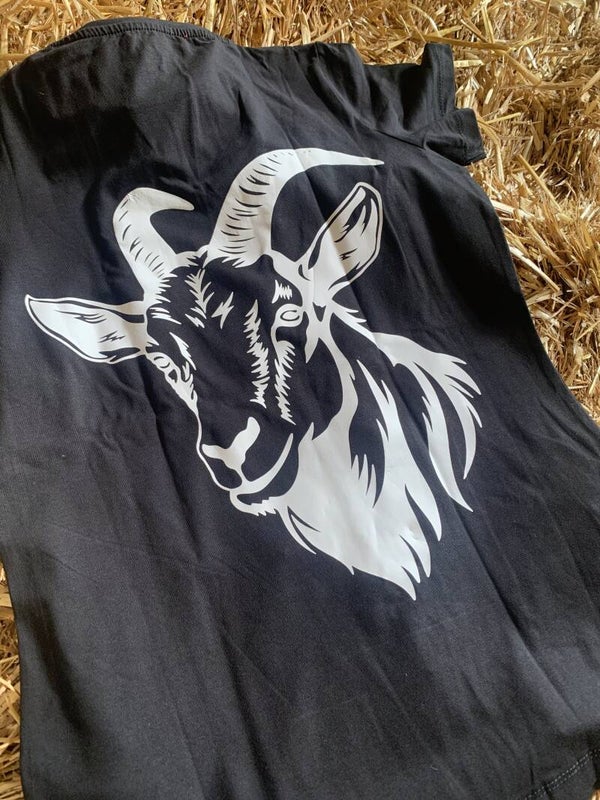 Achterop het T-shirt staat de afbeelding van een geit, op de voorkant van het T-shirt is zowel te kiezen uit het Boerfm als Boerinfm logo