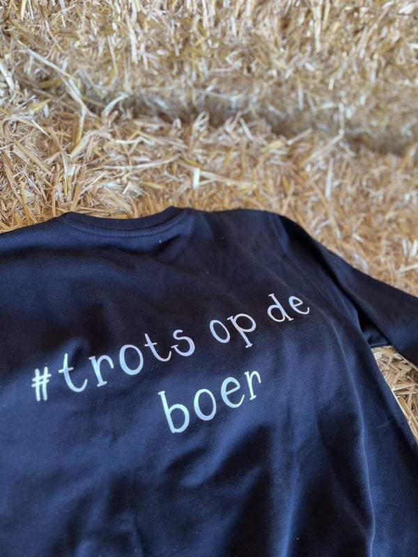 Lekker warme sweater voor bij de koude avonden. Een makkelijke sweater voor onder de overall. Deze sweater heeft achterop de tekst #trots op de boer. Op de voorkant is te kiezen uit zowel het Boerfm logo als het Boerinfm logo.