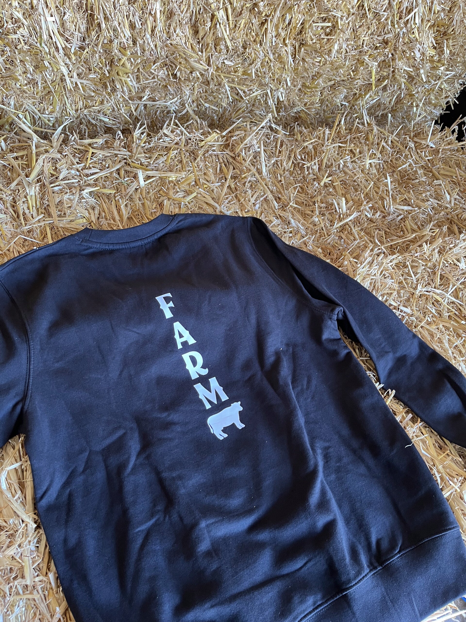 Lekker warme sweater voor bij de koude avonden. Een makkelijke sweater voor onder de overall. Deze sweater heeft achterop de tekst farm met daar onder de afbeelding van een koe. Op de voorkant is te kiezen uit zowel het Boerfm logo als het Boerinfm logo.