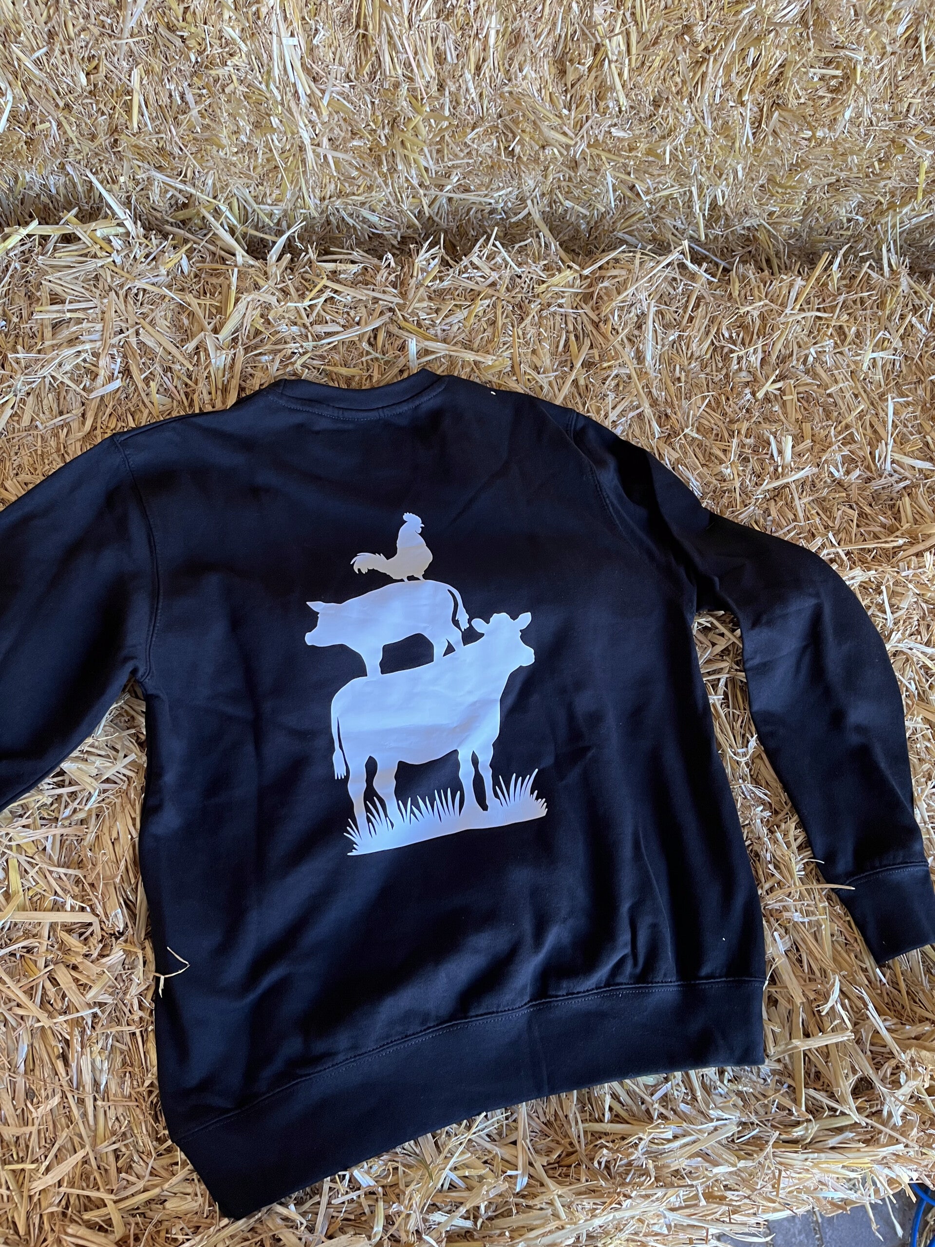 Lekker warme sweater voor bij de koude avonden. Een makkelijke sweater voor onder de overall. Deze sweater heeft achterop de afbeelding van een koe, varken & haan. Op de voorkant is te kiezen uit zowel het Boerfm logo als het Boerinfm logo.