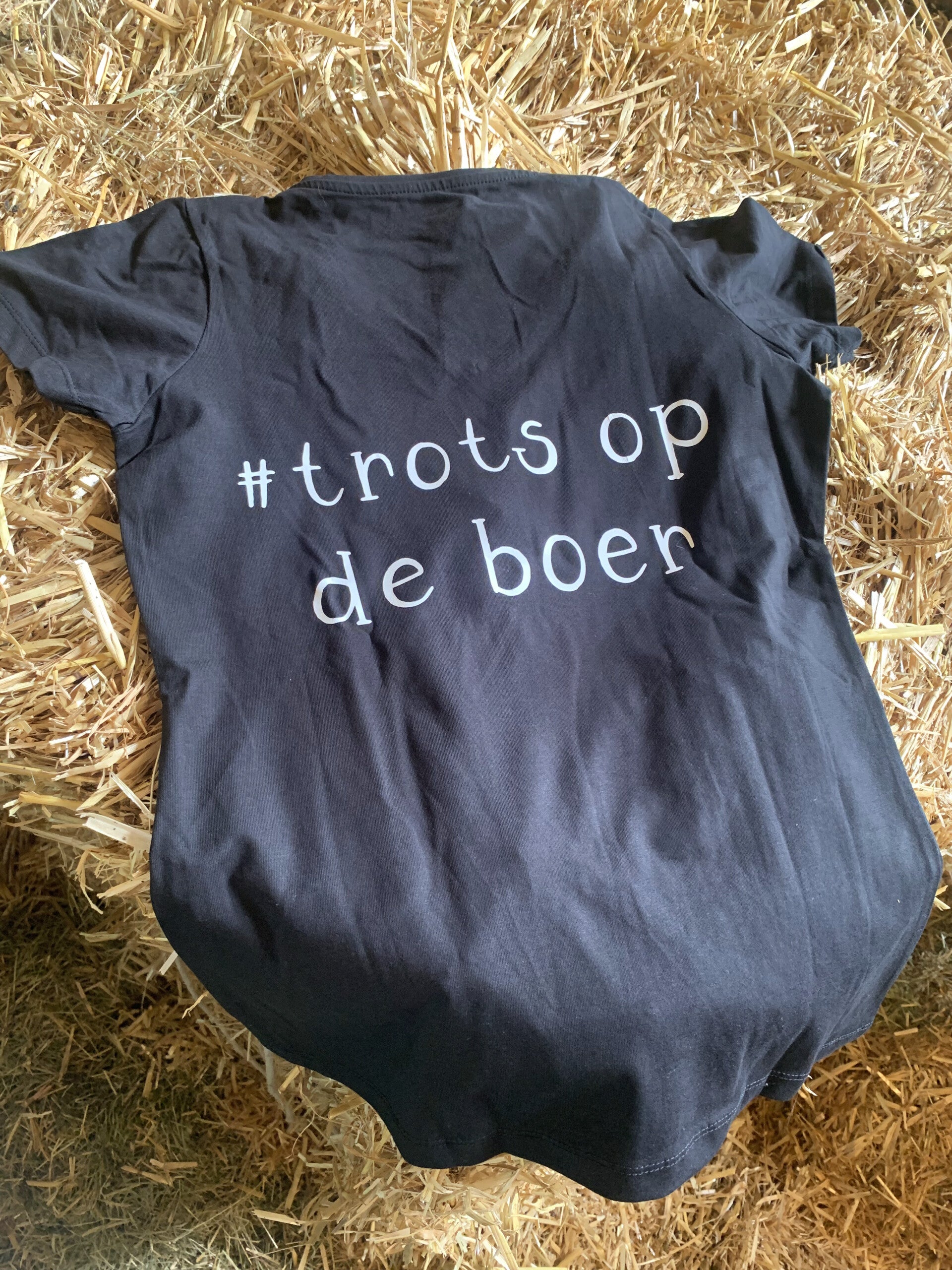 Achterop het T-shirt staat de tekst #trots op de boer, op de voorkant van het T-shirt is zowel te kiezen uit het Boerfm als Boerinfm logo. Ook kan er gekozen worden voor een v-hals of ronde hals.