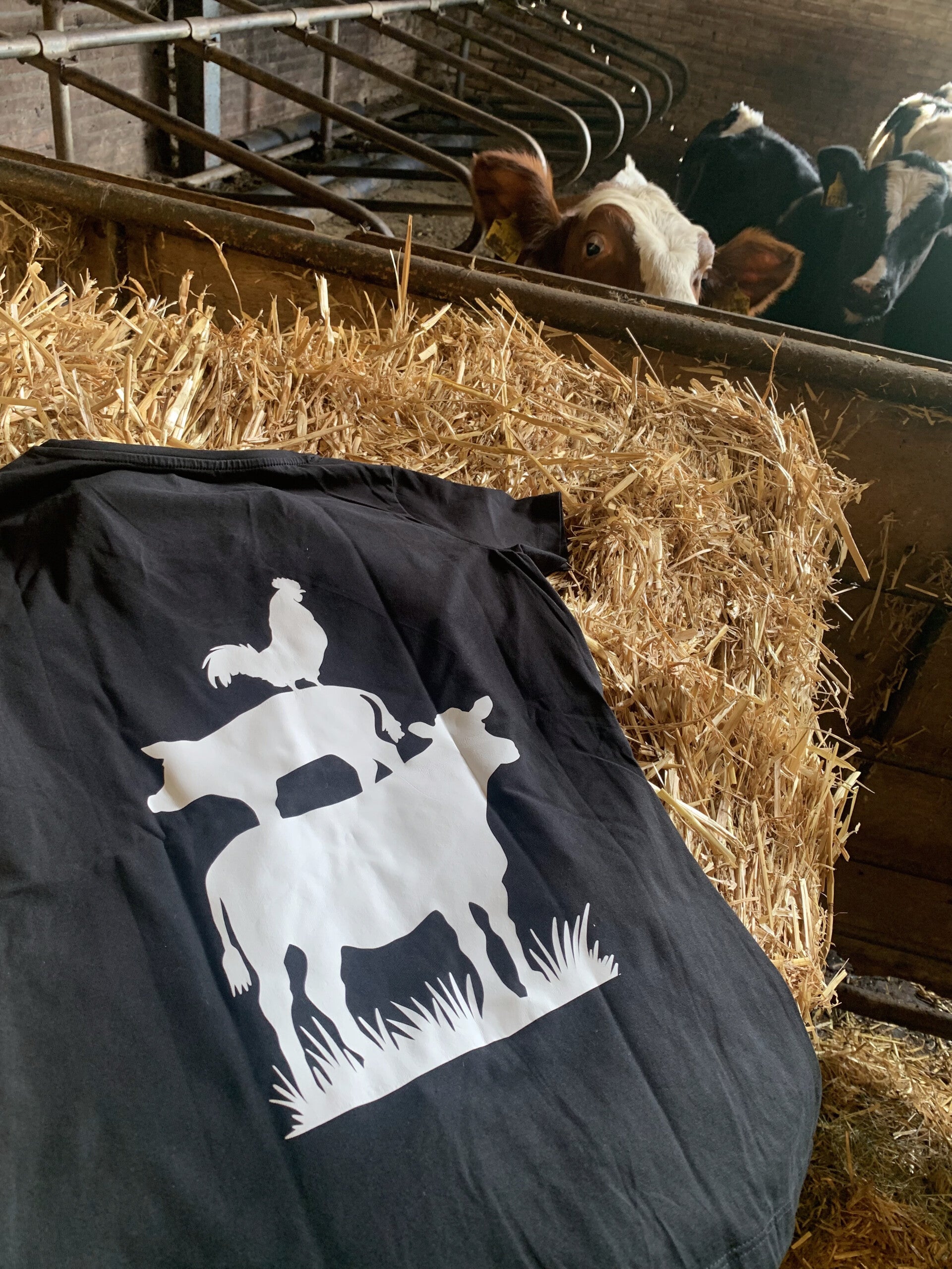 Achterop het T-shirt staat de afbeelding van een koe, varken & haan, op de voorkant van het T-shirt is zowel te kiezen uit het Boerfm als Boerinfm logo. Ook kan er gekozen worden voor een v-hals of ronde hals.
