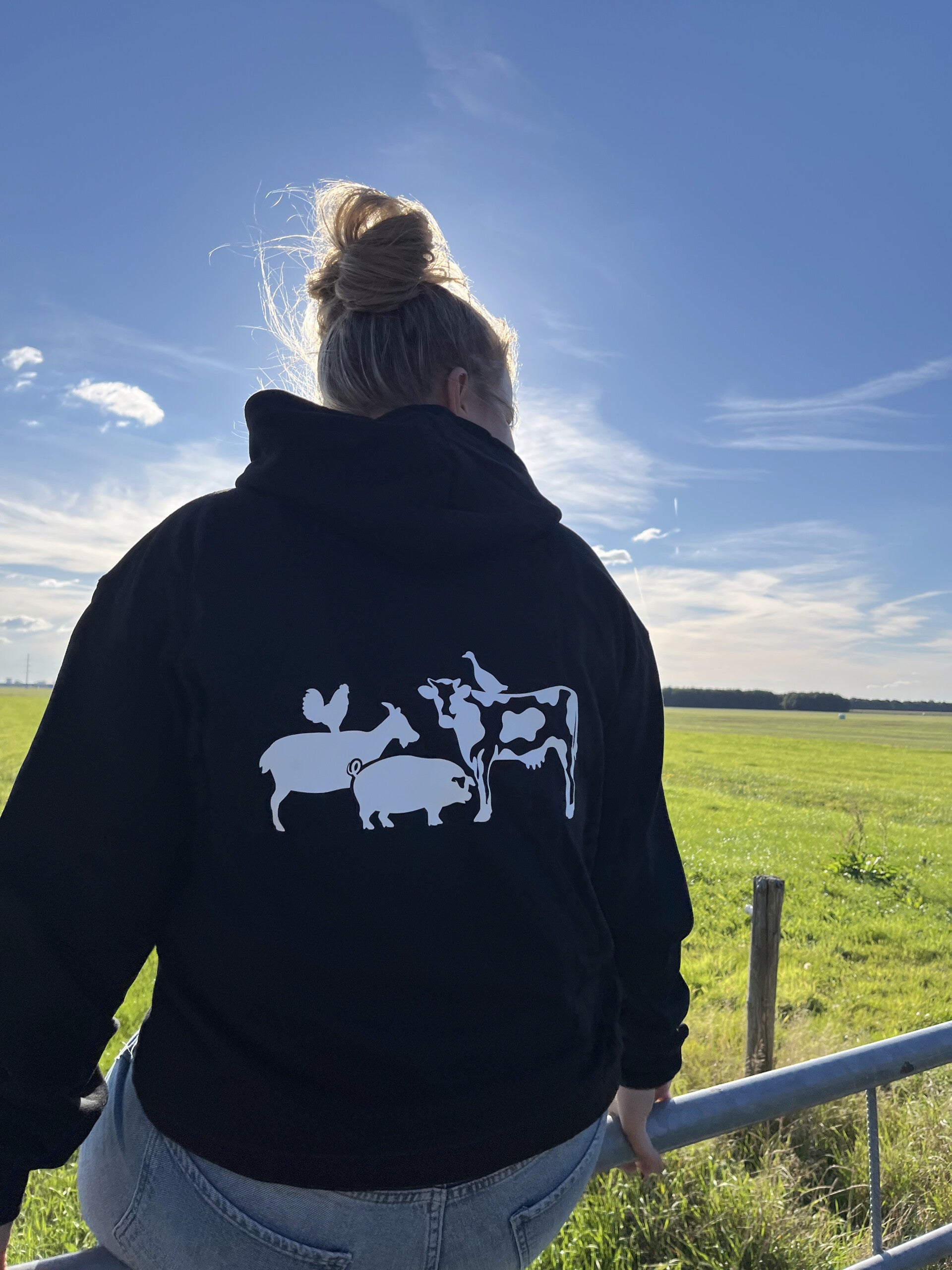 Lekker warme hoodie voor bij de koude avonden. Een makkelijke hoodie voor onder de overall. Deze hoodie heeft achterop de afbeelding van een haan, geit, varken, eend en een koe. Op de voorkant is te kiezen uit zowel het Boerfm logo als het Boerinfm logo.