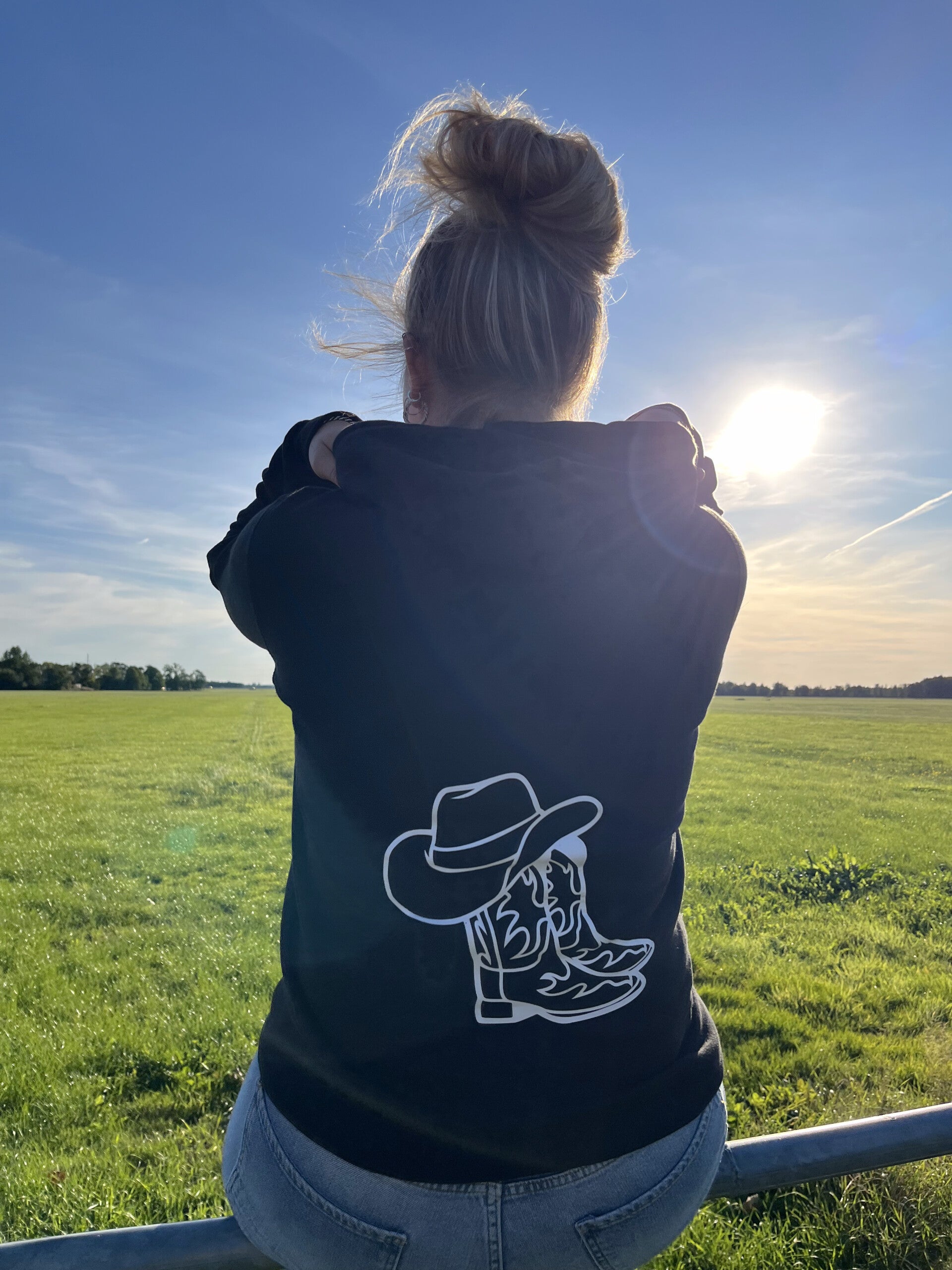 Lekker warme hoodie voor bij de koude avonden. Een makkelijke hoodie voor onder de overall. Deze hoodie heeft achterop de afbeelding van een paar cowboylaarzen met een hoed. Op de voorkant is te kiezen uit zowel het Boerfm logo als het Boerinfm logo.