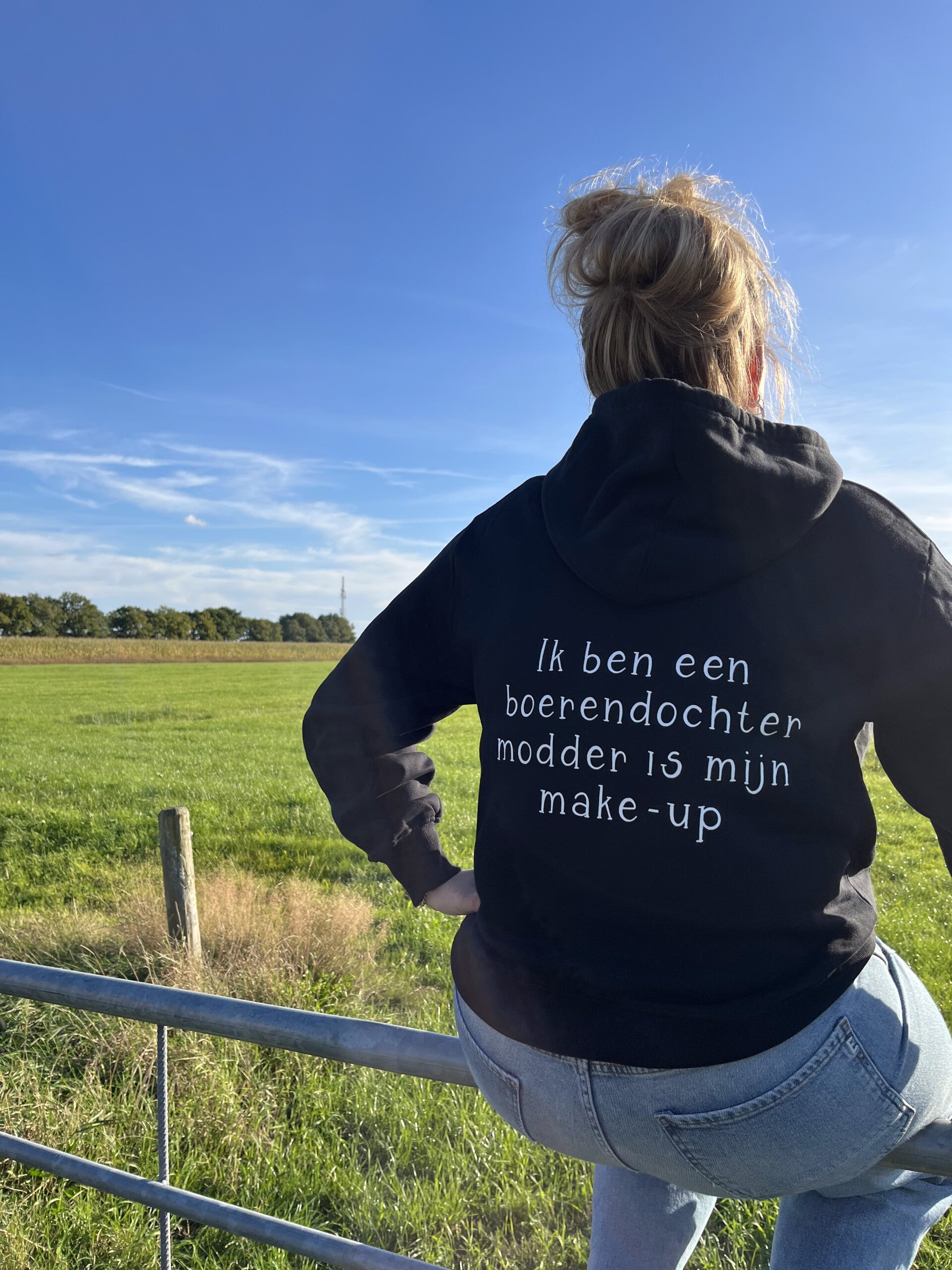 Lekker warme hoodie voor bij de koude avonden. Een makkelijke hoodie voor onder de overall. Deze hoodie heeft achterop de tekst Ik ben een boerendochter, modder is mijn make-up. Op de voorkant is te kiezen uit zowel het Boerfm logo als het Boerinfm logo.