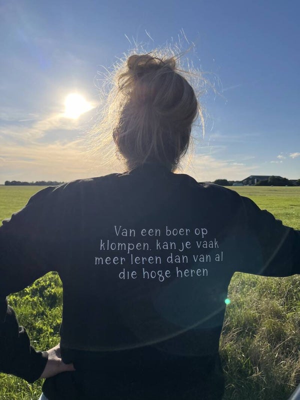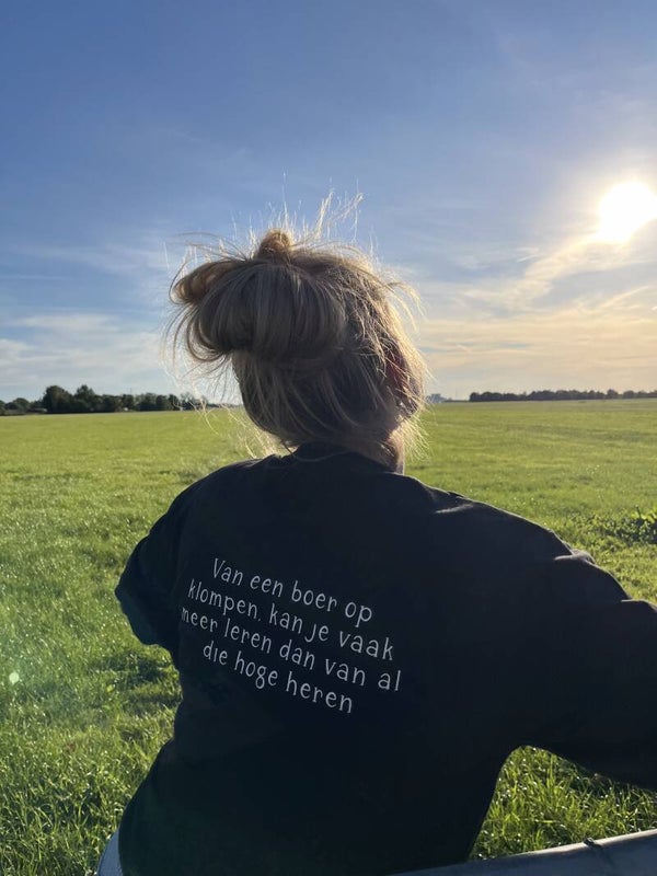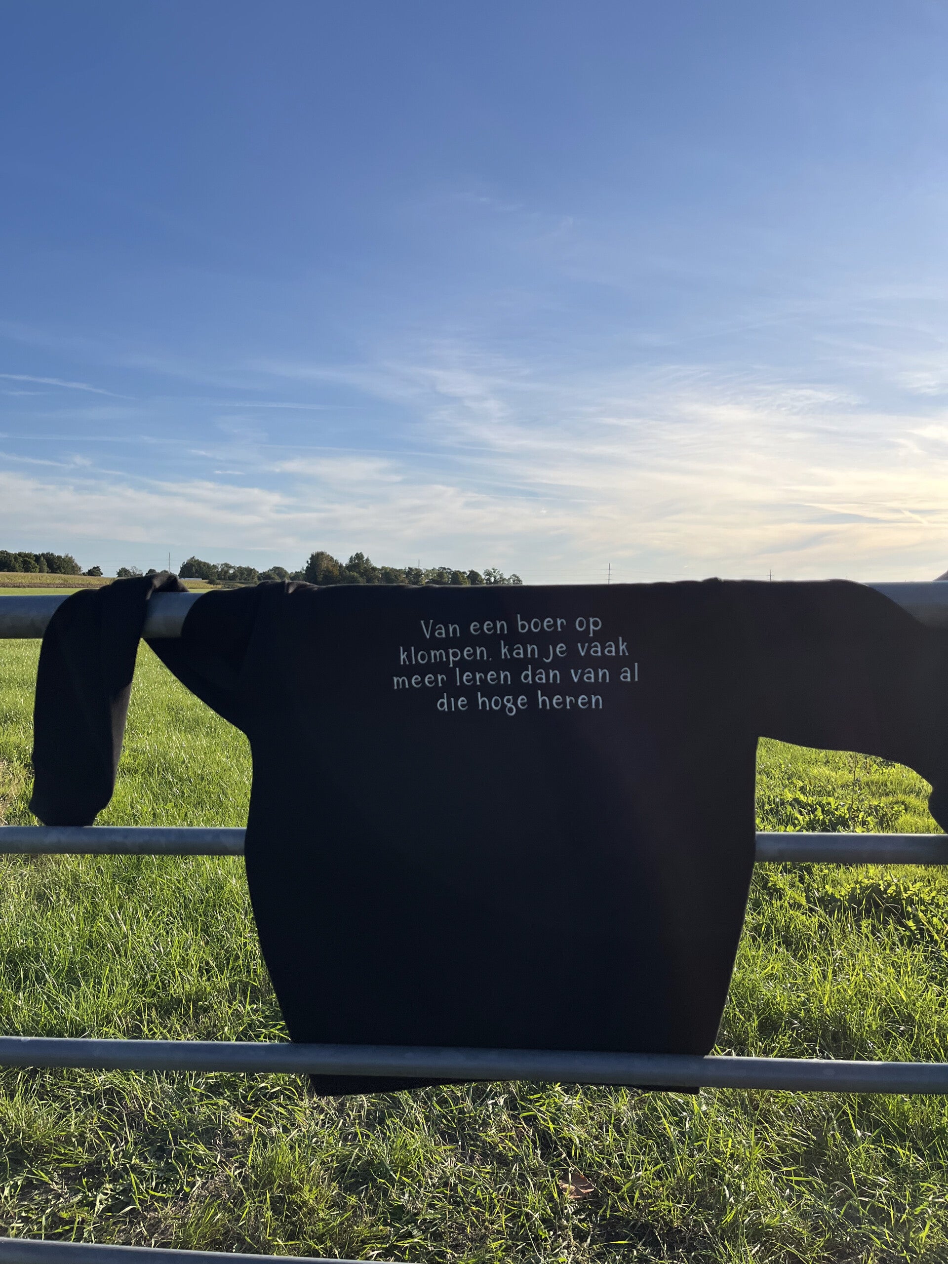 Lekker warme hoodie voor bij de koude avonden. Een makkelijke hoodie voor onder de overall. Deze hoodie heeft achterop de tekst van een Boer op klompen, kan je vaak meer leren dan, van die hoge heren.. Op de voorkant is te kiezen uit zowel het Boerfm logo als het Boerinfm logo.