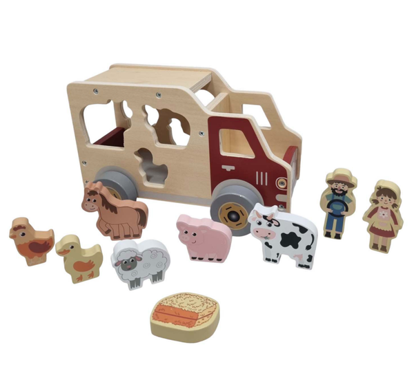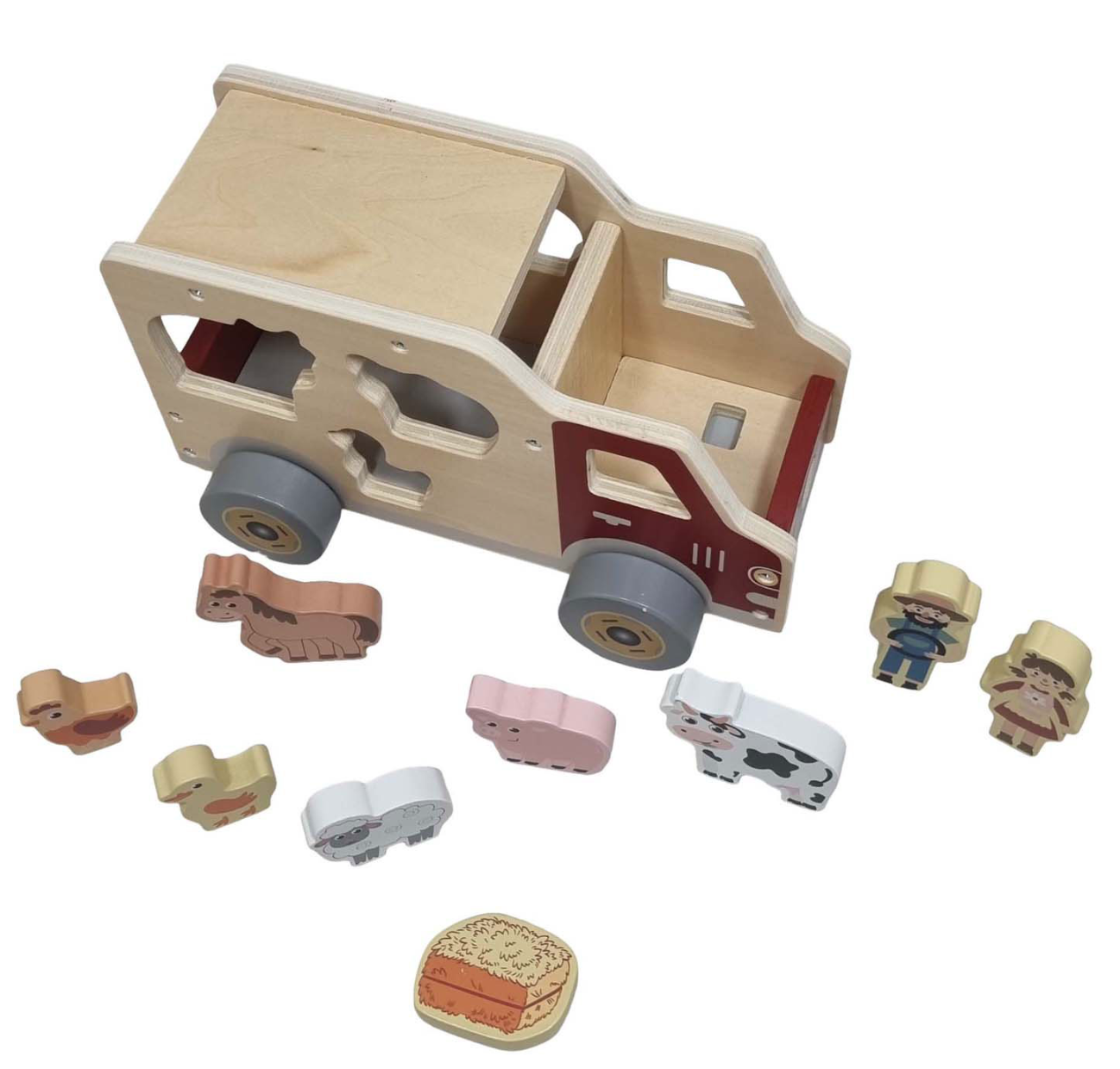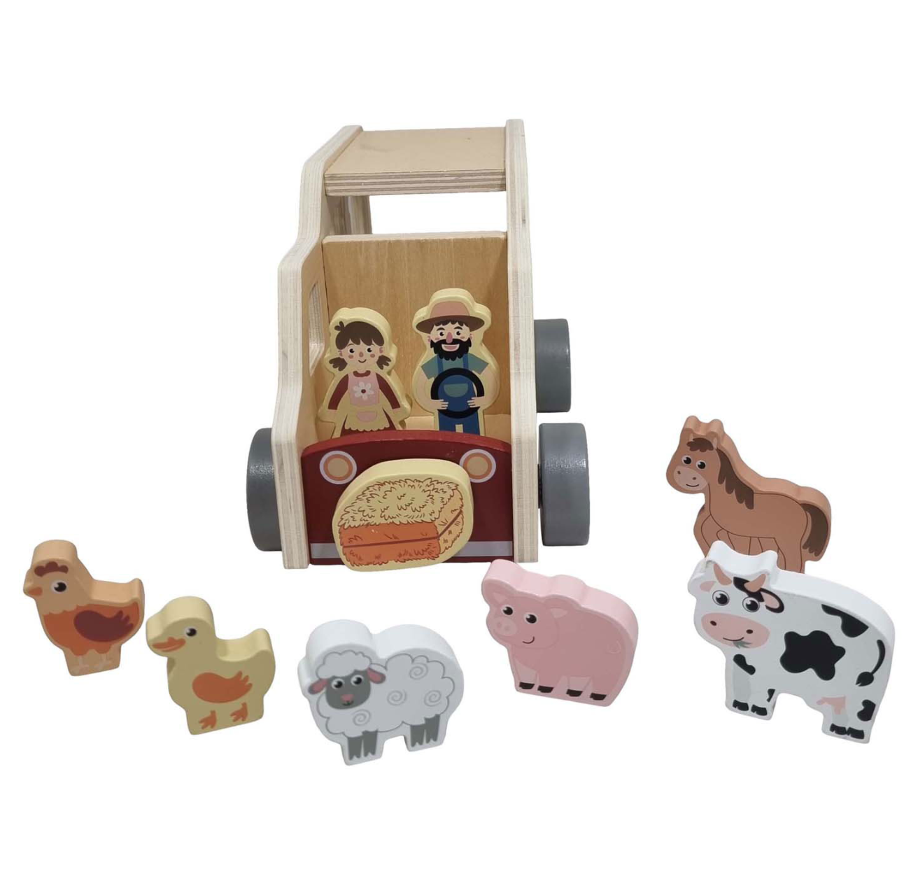 Deze leuke houten vormenauto van Playwood is een prachtig speelgoedvoertuig dat kinderen uitnodigt om te spelen en te leren. Met het boerderijthema en kleurrijke figuren van o.a. een paard, schaap en een boer en boerin biedt deze wagen eindeloos speelplezier en stimuleert het de ontwikkeling van fijne motoriek en vormherkenning.