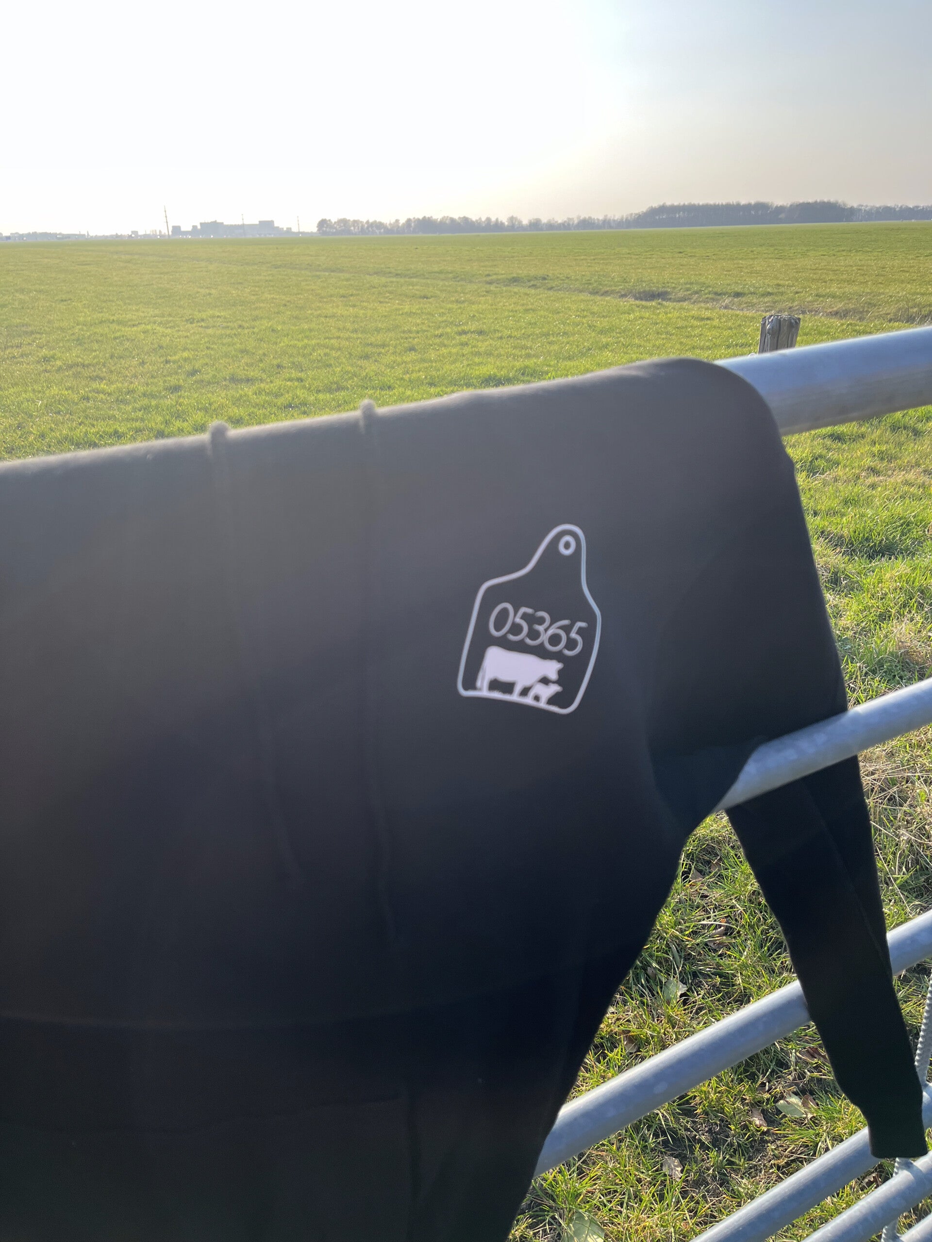 Lekker warme hoodie voor bij de koude avonden. Een makkelijke hoodie voor onder de overall. Deze hoodie heeft op de voorkant een afbeelding van een oornummer, je kunt zelf je favoriete oormerk doorgeven van bijvoorbeeld je lievelings koe, schaap, geit of varken. De achterkant van de trui blijft blanco.